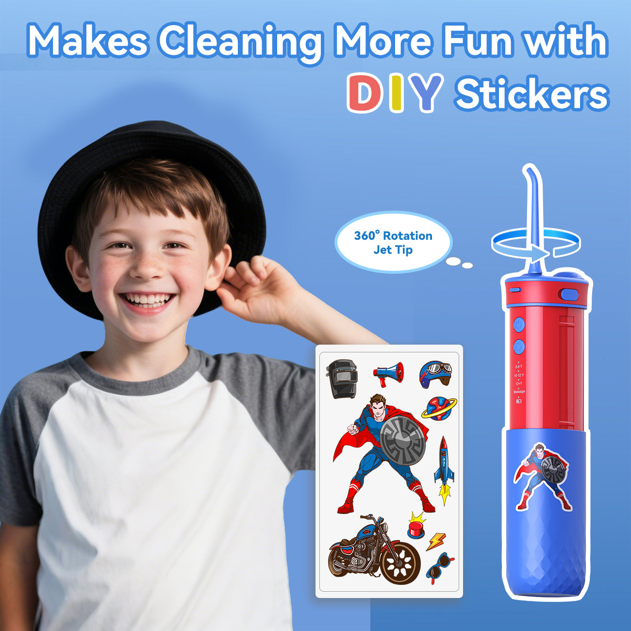 Turn dental care into playtime! Let kids customize their flosser with colorful DIY stickers and choose from vibrant designs. The easy-grip handle, 230mL large tank (no refills needed!), and fun operation make flossing a breeze. Finally – a routine they’ll love to stick with!