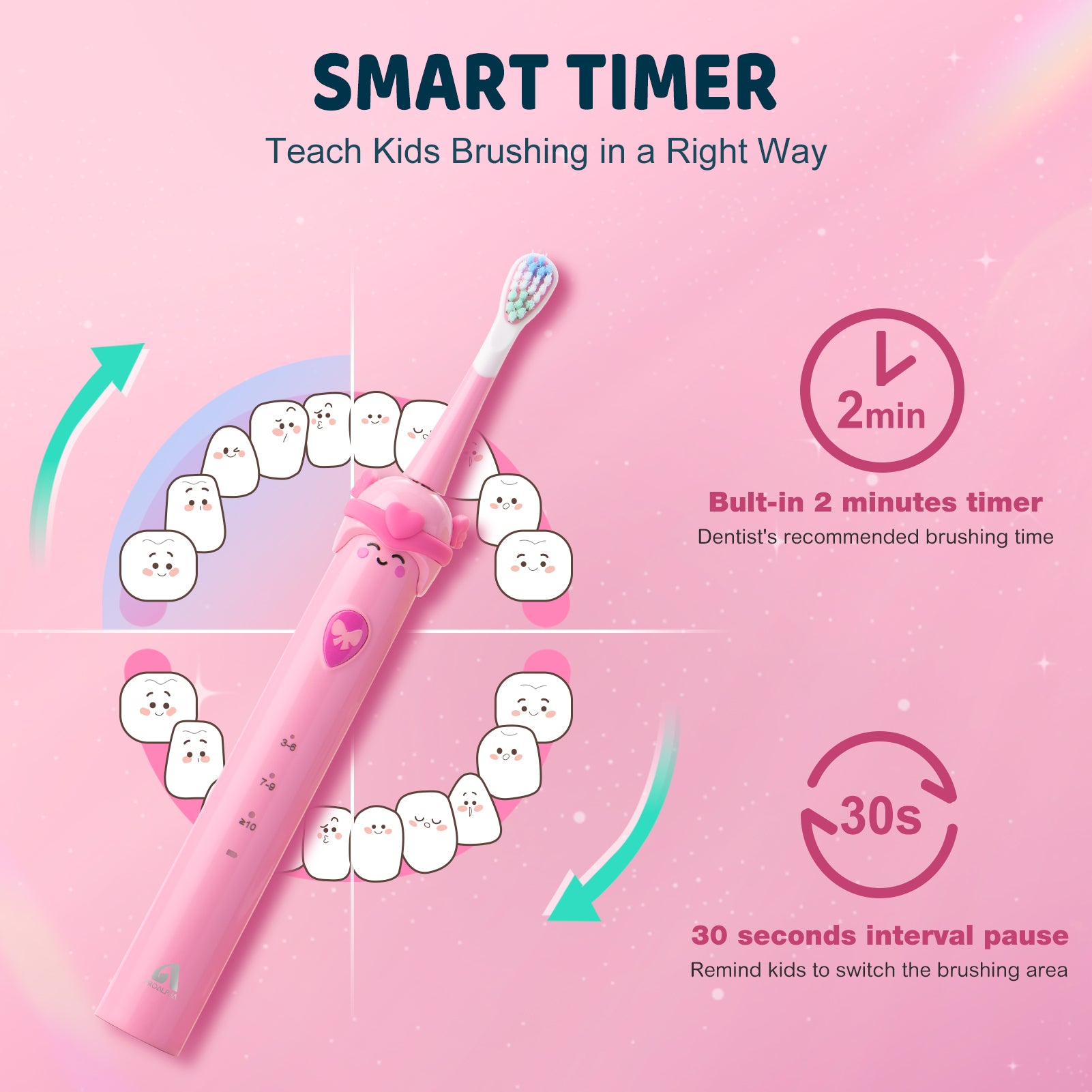 - KID SMART TIMER - This children electric toothbrush has a built-in 2 minutes timer to help train kids brushing the recommended time, and 30 seconds interval pausing alerts when to move to the next quadrant of the mouth to ensure a thorough cleaning..