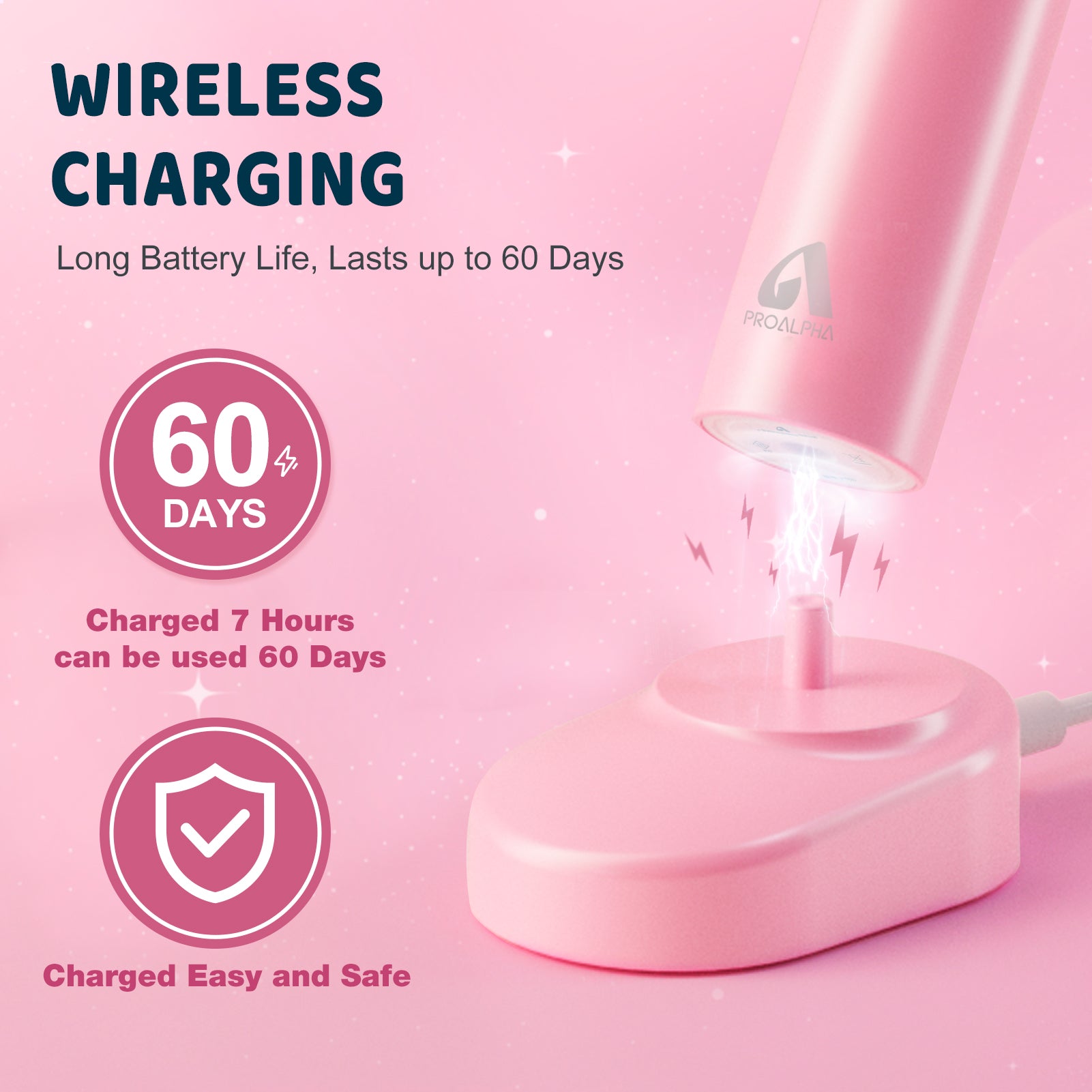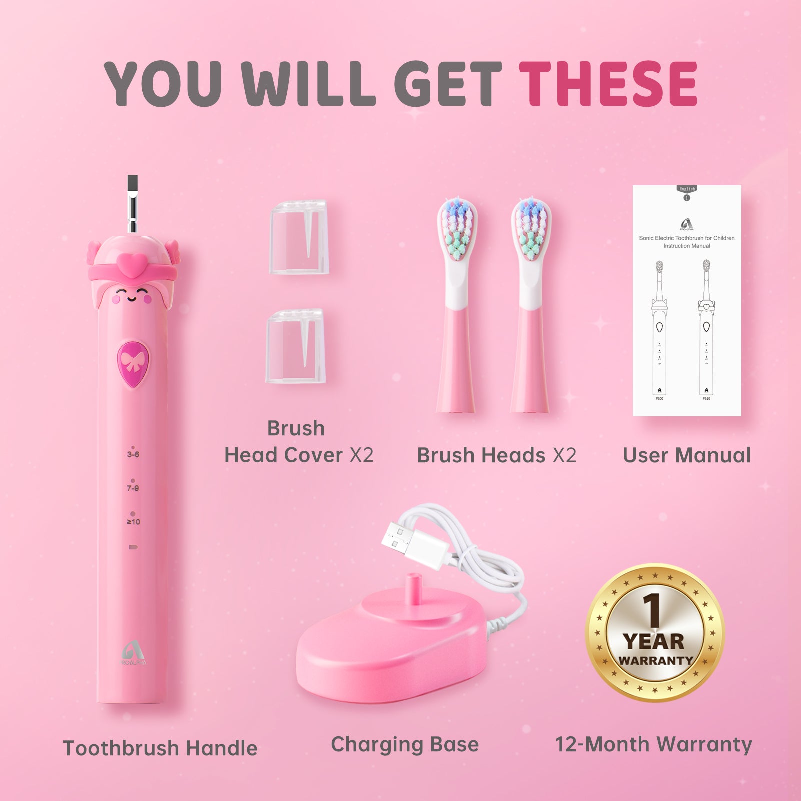 - PACKAGE & WARRANTY - Rechargeable children's toothbrush, 2 replacement brush heads, 2 brush covers, wireless charging base, user manual, and industry-leading 2-Year Warranty.